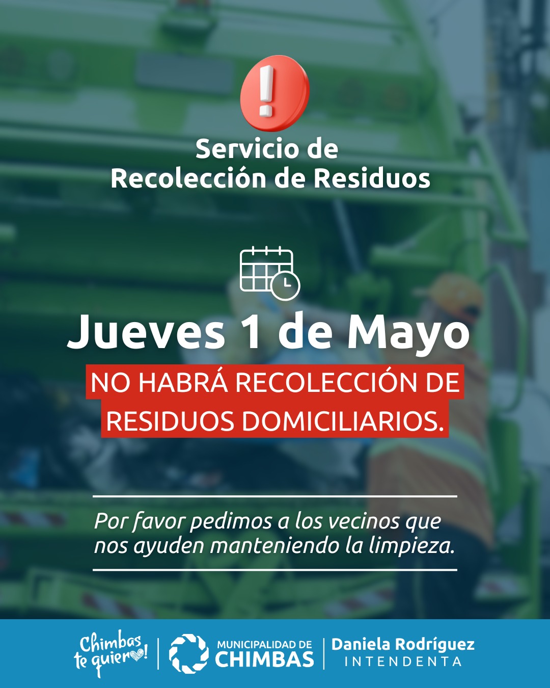 IMPORTANTE SIN RECOLECCIÓN DE RESIDUOS Domingo, 30 de Abril | 2025 Prensa IMPORTANTE – SIN RECOLECCIÓN DE RESIDUOS El jueves 1 de mayo no habrá servicio de recolección de residuos por el feriado del Día del Trabajador.Te pedimos no sacar la basura ese día para mantener limpio nuestro departamento
