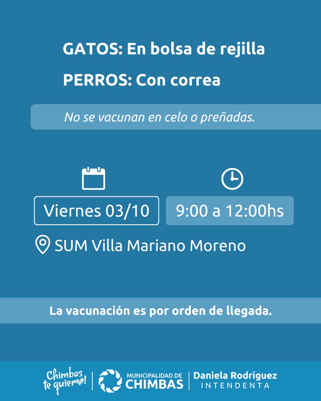 Este viernes 3 de octubre estaremos realizando en horarios de 9 a 12hs, el servicio de vacunación antirrábica en SUM Villa Mariano Moreno ubicado por calle Proyectada entre Vicente Álvarez y 13 de Junio.