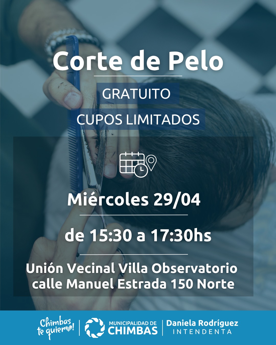 Este Miércoles 28 de abril, estaremos realizando corte de cabello de forma gratuita (mayores de 6 años y adultos) en la Unión Vecinal Villa Observatorio.
