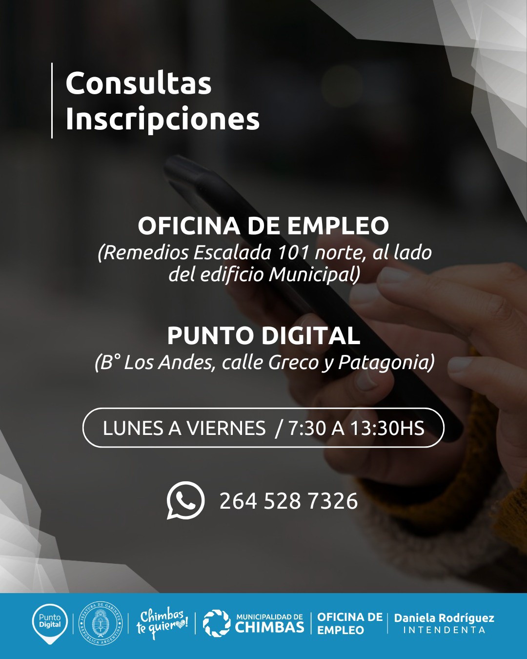 Para más información comunícate al WhatsApp 2645287326 o acércate a la Oficina de Empleo ubicada al lado del Edificio municipal/ Punto Digital ubicado por calle Greco y Patagonia de lunes a viernes de 7:30 a 13:30hs.